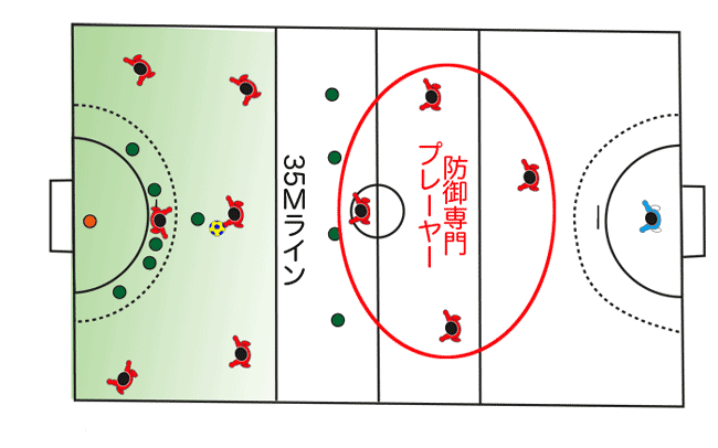35mラインの中へは最大6人しか入ることが出来ません。従って、その地域での攻防状況は7人制と同じです。下の図では、赤が攻撃していますが、4人の防御プレーヤーは、相手の攻撃に備えて待機しています。